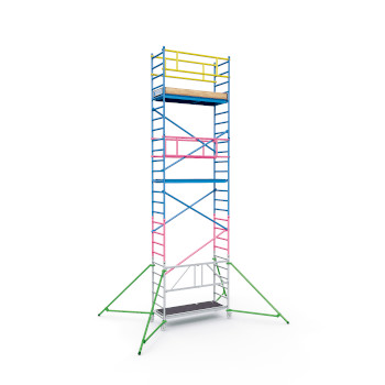 Andamio móvil con base plegable de forma fácil mediante pasador blocante. Se suministra de serie con estabilizadores laterales. Incluye ruedas de PVC, Ø125mm con freno. Recomendamos accesorios adaptador para regular desniveles. Dimensiones del bastidor: Ø Tubo vertical y tubo horizontal: 45mm. Medida exterior del andamio: 0,75m x 1,80m. Medida de la plataforma: 0,60m x 1,80m.